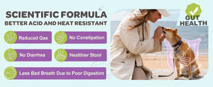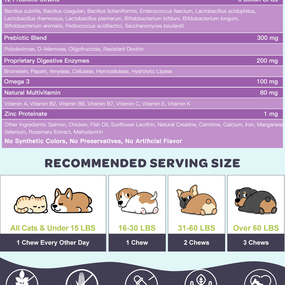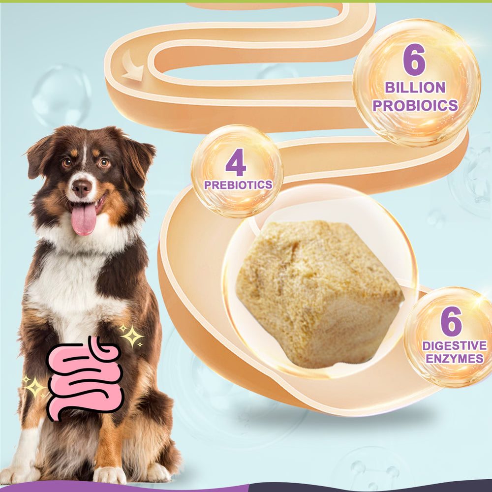 These chews feature 12 strains of probiotics, 4 prebiotics, and 5 enzymes that target gut health and improve digestion. They help relieve common issues like bad breath, bloating, constipation, and diarrhea, while also supporting skin health and reducing allergy symptoms such as itching and shedding.