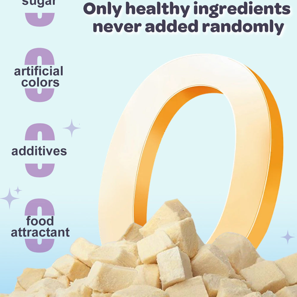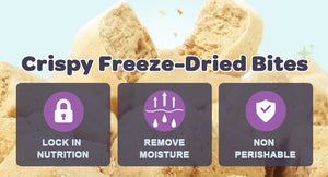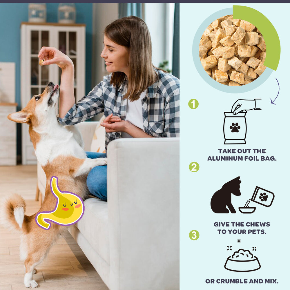 Crunchy texture is more popular with pets. Freeze-drying technology removes moisture and and locks activity and nutrients into each bite. Once consumed by your pets, these active ingredients will be reactivated and provide powerful benefits to your pets.