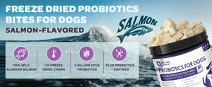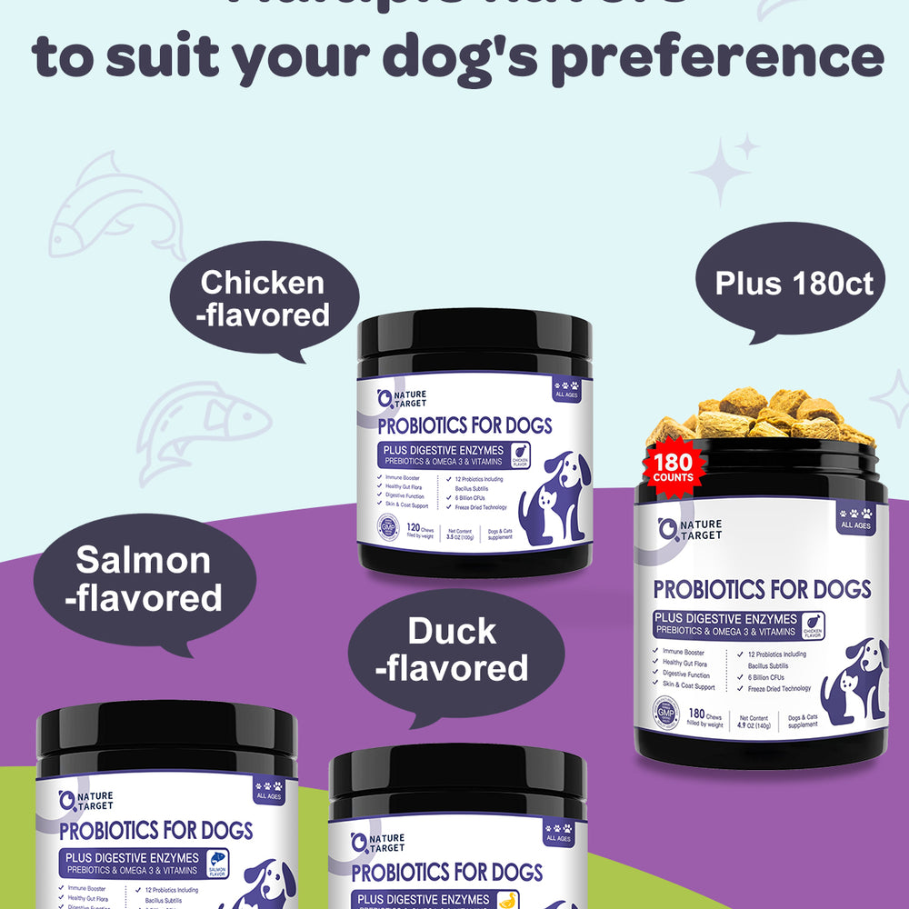 Nature Target Freeze Dried Probiotics for Dogs & Cats added with 6 billion CFUs probiotics, prebiotics, digestive enzymes, omega 3, multivitamins and minerals to help your pets keep overall health. It contains 120 raw salmon bites and is designed for all breeds dogs and cats!