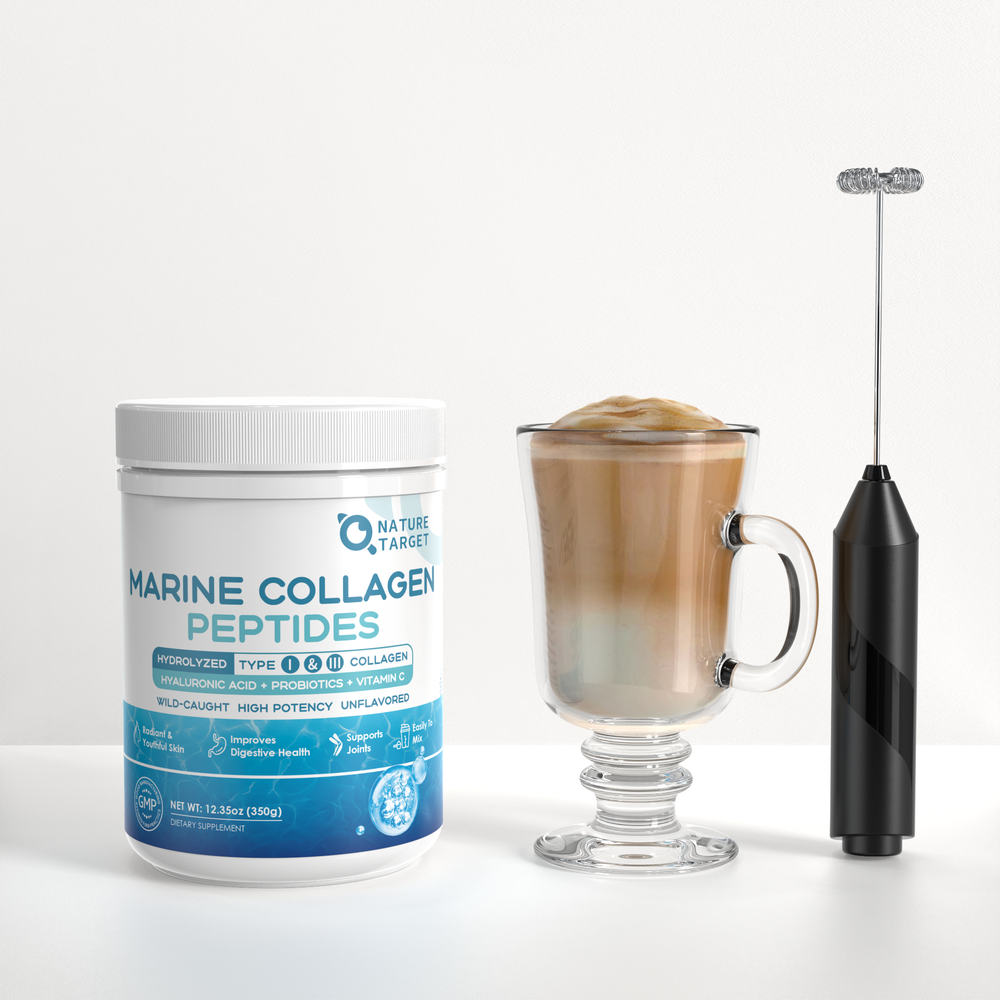 Nature Target’s Marine Collagen Peptides provide a powerful blend of wild-caught fish and grass-fed bovine collagen, enriched with hyaluronic acid, vitamins, and probiotics to support youthful skin, healthy hair, and strong nails.