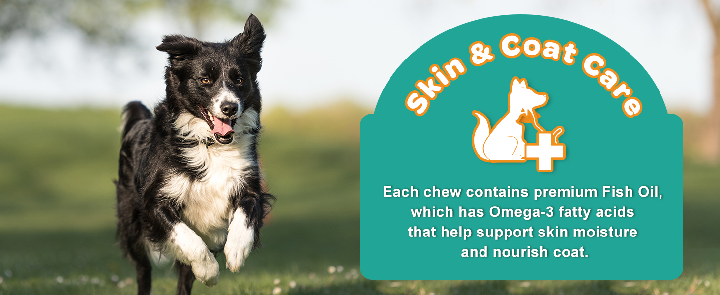 Rich in DHA & EPA, Omega-3 and Omega-6 fatty acids from premium fish oil and flaxseed oil, these chews promote a healthy diet and fight inflammation from allergies. They help moisturize your dog's skin, relieve shedding, and combat dry, flaky skin, improving overall skin condition. Antioxidants like Vitamin E & C and Zinc contribute to a shiny, glossy coat. Omega-3s also support joint and brain health, making them perfect for senior dogs.