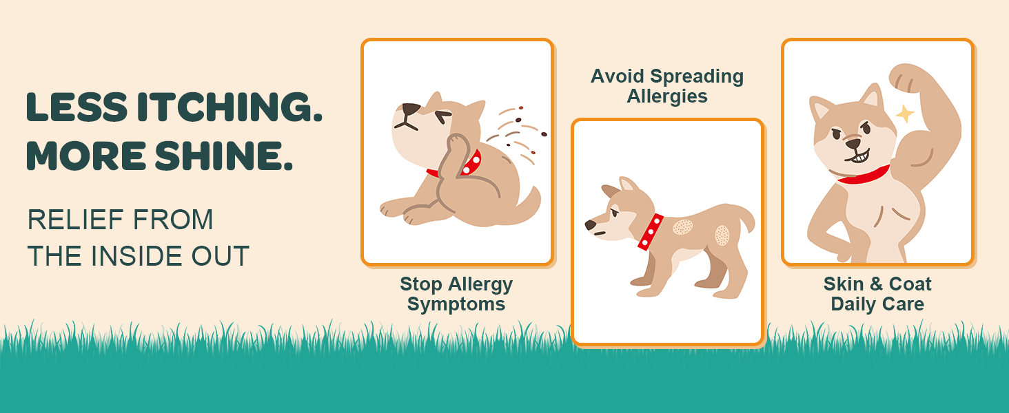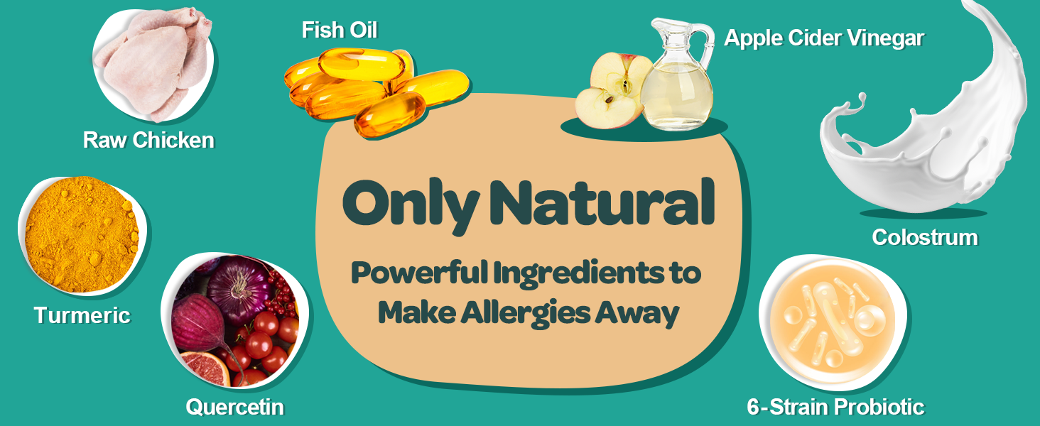 Hidden inflammation is the main driver of allergic reactions in the body. Our allergy relief chews contain Turmeric, Quercetin + Bromelain Combo, and Apple Cider Vinegar, all with powerful anti-inflammatory, antihistamine, and antioxidant properties. This combination helps reduce inflammation, pain, itchiness, and discomfort caused by hot spots, hair loss, sneezing, scratching, and paw licking. It provides timely allergy relief, preventing more severe reactions.