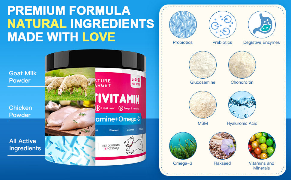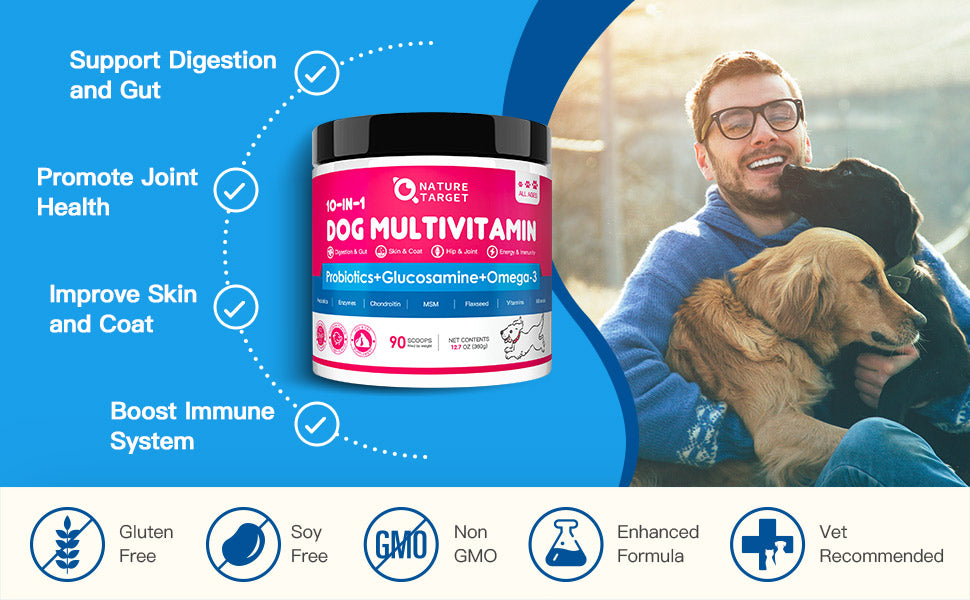 At Nature Target, all of our products are from natural materials around the world and the R&D is backed by scientific tests. Our dog supplement is corn, soy, gluten-free and Non-GMO. We have been providing nutritional and safe dog supplements and our goal is to make your four-legged friend live a happier and healthier life.
