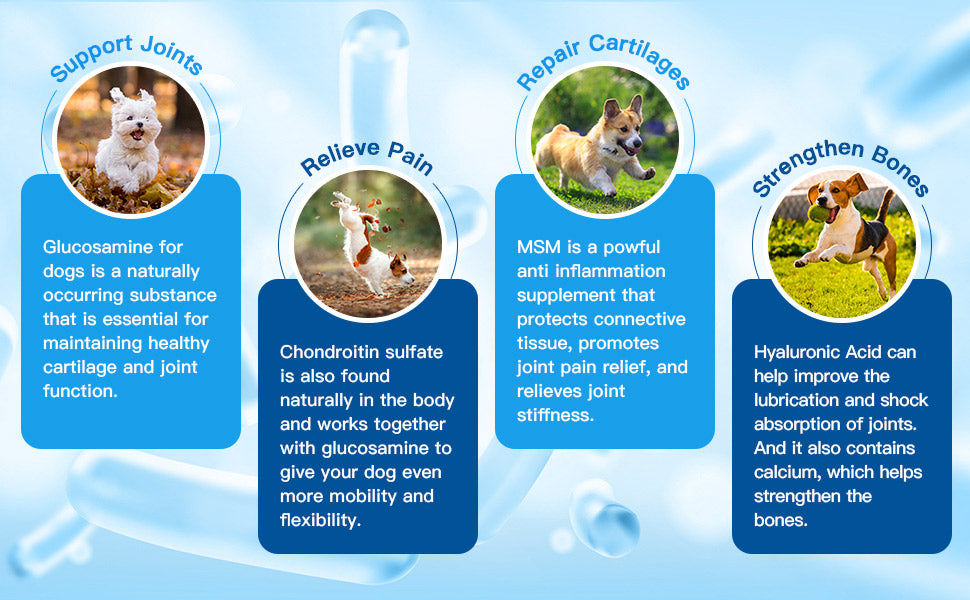 Hyaluronic Acid can help improve the lubrication and shock absorption of joints and help reduce joint pain and inflammation. And it also contains Calcium, which is vital for proper skeletal development and can help strengthen the bones.